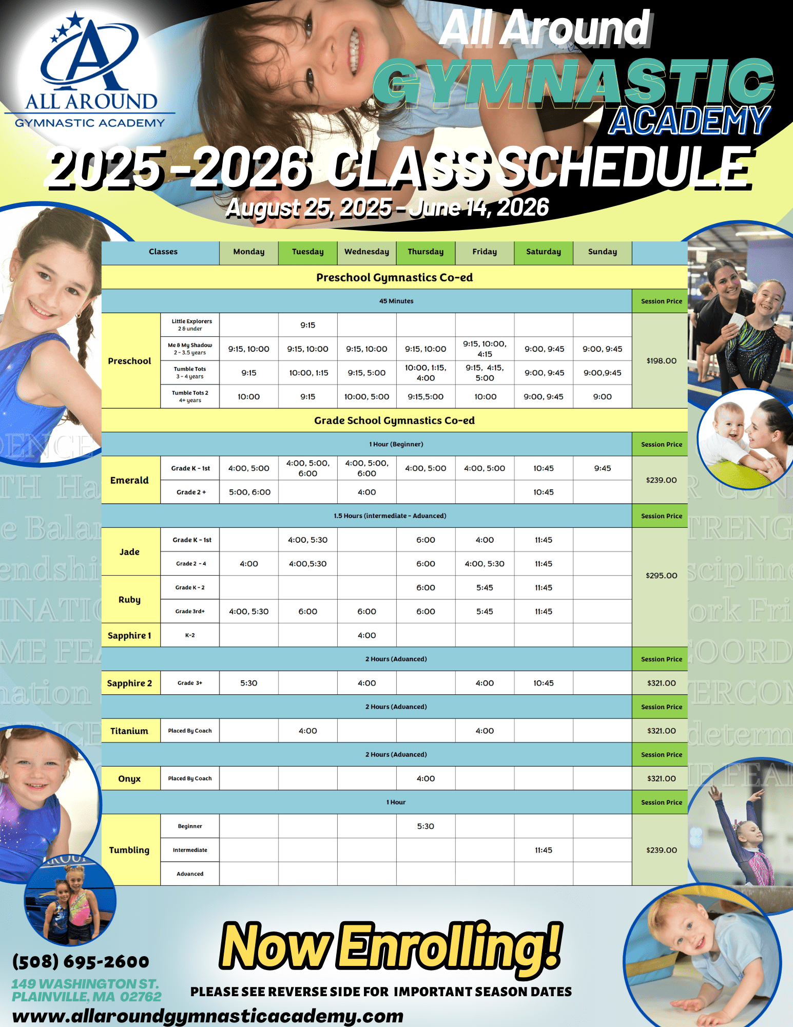 Click here for our 2025-2026 Class Schedule. Classes are filling up so call, visit or register online to secure your child's spot!